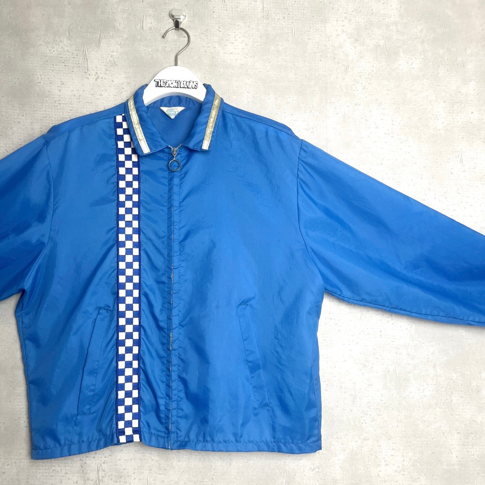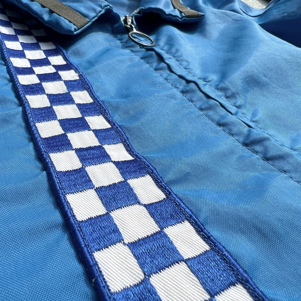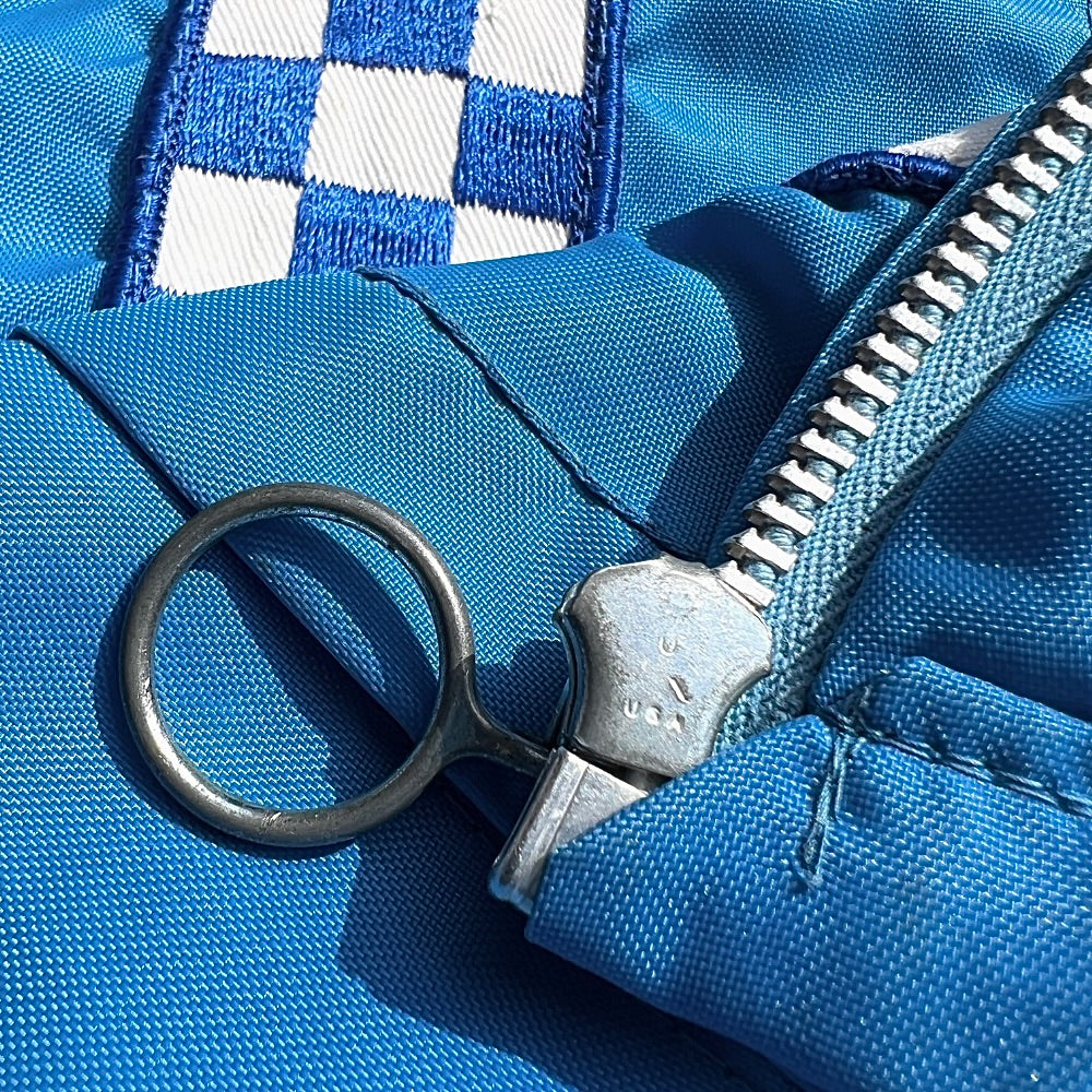 鮮やかなシアンカラーと、円型TALONのアルミジップや襟元のリフレクター、刺繍のチェッカーフラッグがかなりアクセント。