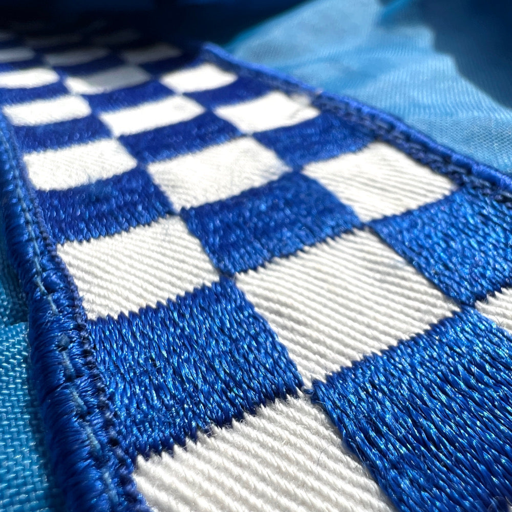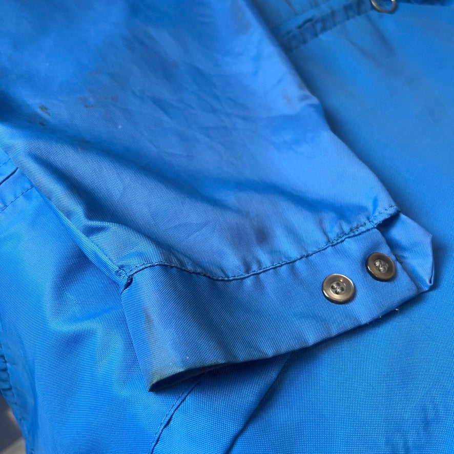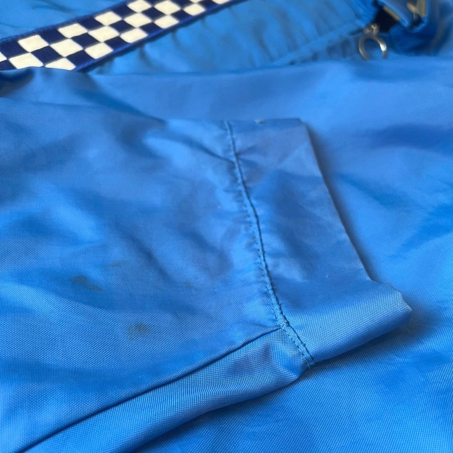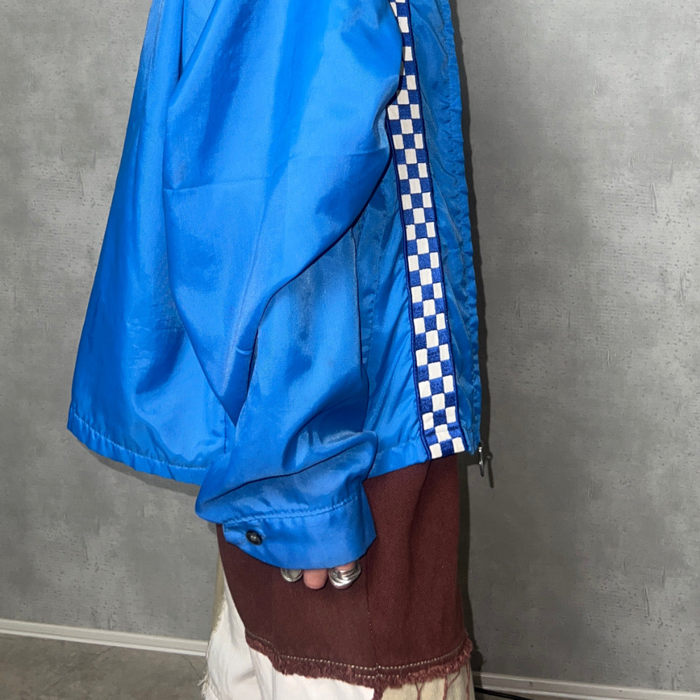 鮮やかなシアンカラーと、円型TALONのアルミジップや襟元のリフレクター、刺繍のチェッカーフラッグがかなりアクセント。