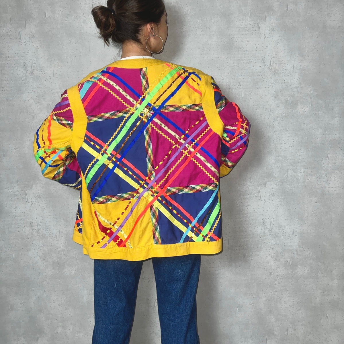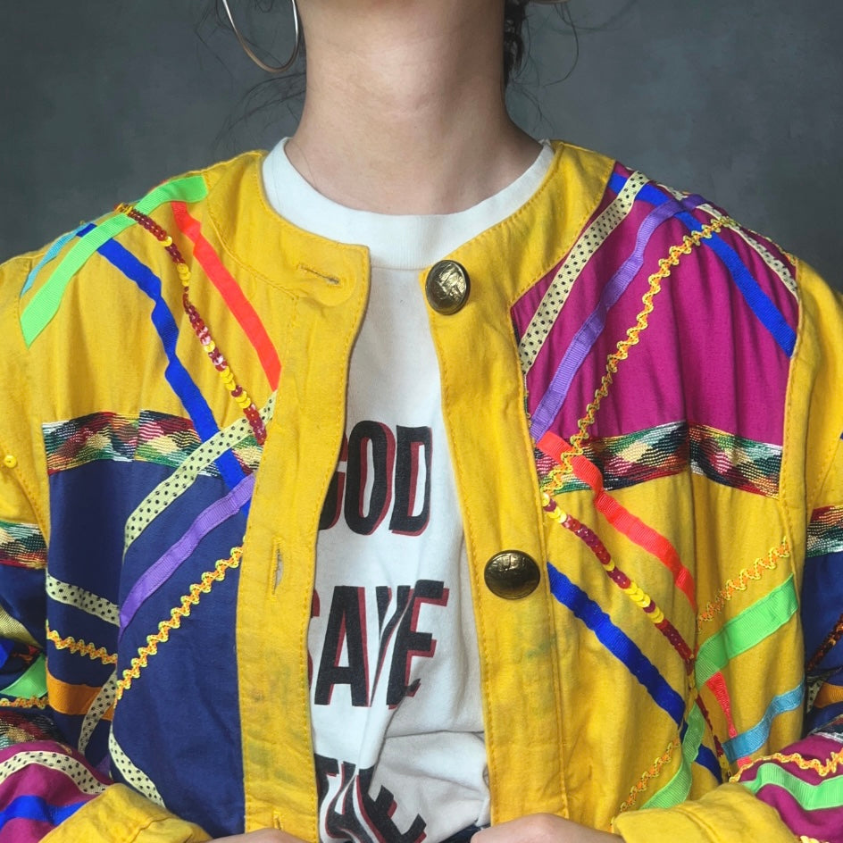 アバンギャルドなデザインに一目惚れしてセレクトしたパッチワークジャケット。