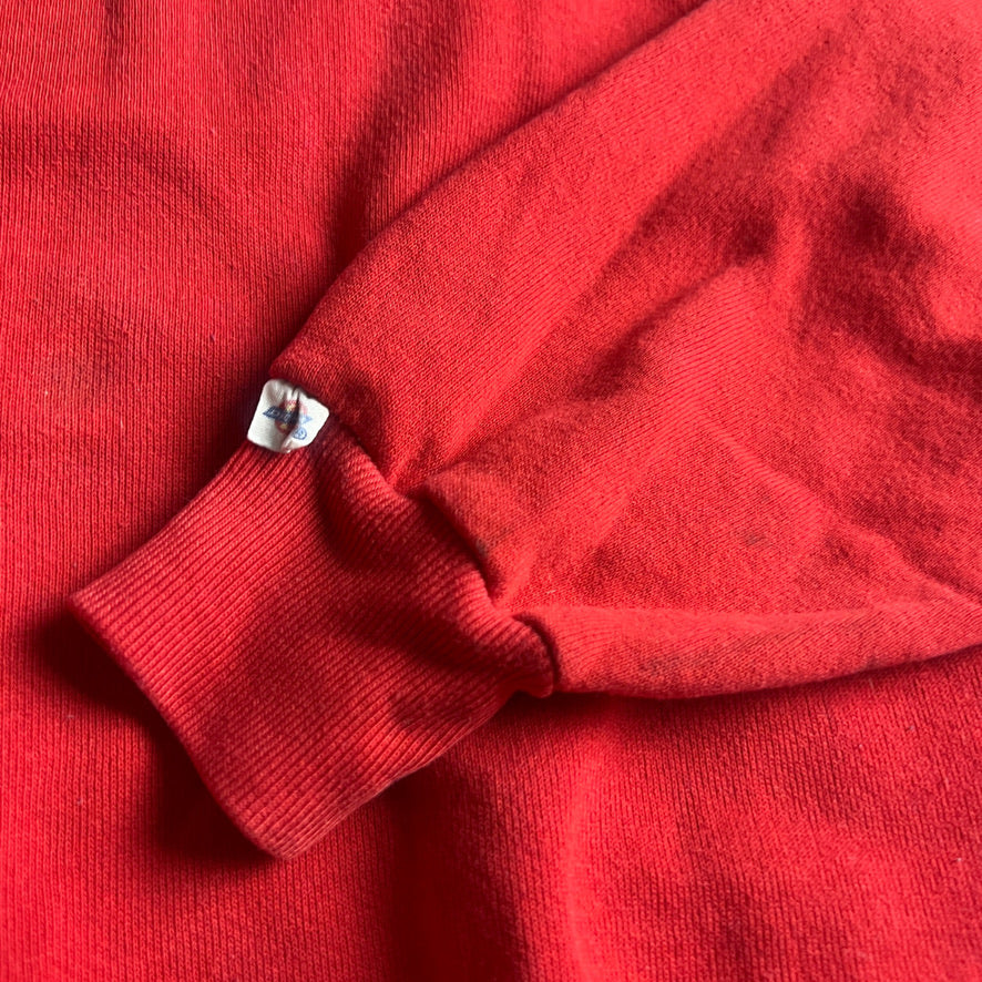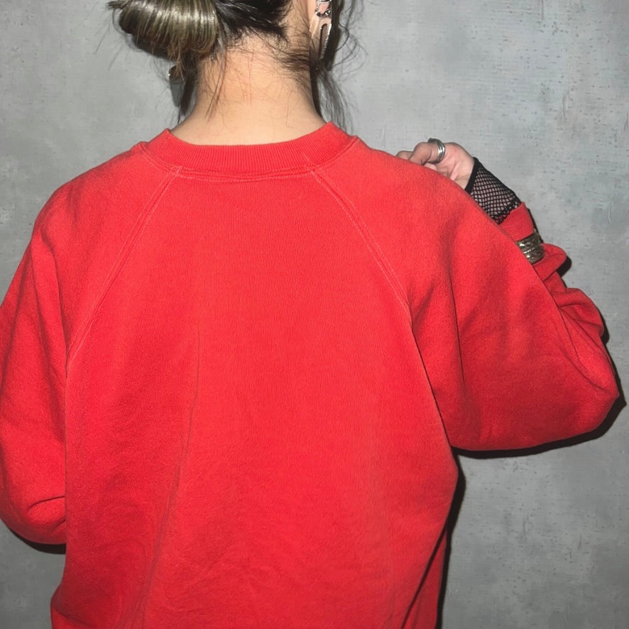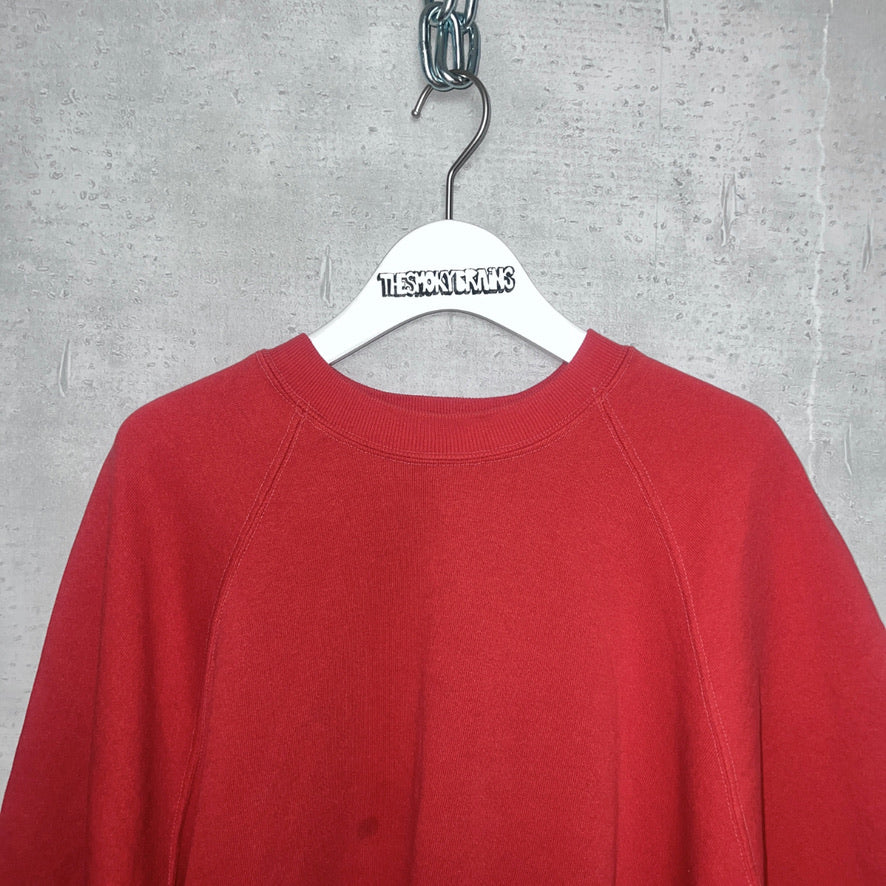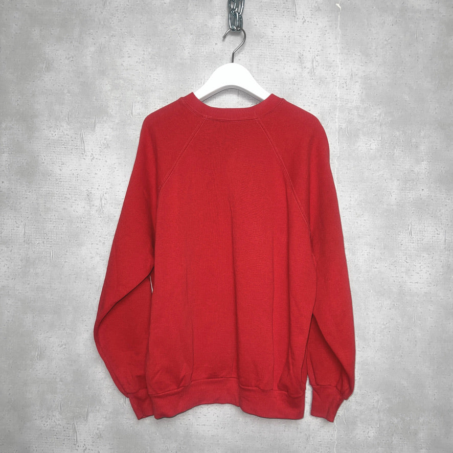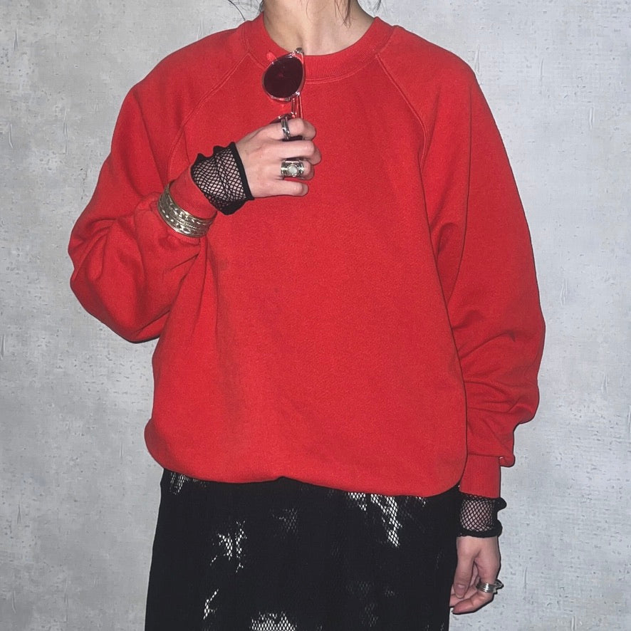 また当初は発色の良い赤であっただろう色見も、経年変化で色褪せてきた具合がまた絶妙。こういう褪せた赤は古着でしか味わえないので、ボトムスのカラーを幅広く選べるのも特徴。更にはラグランと、この80'Sらしいネックの丸みが良い。