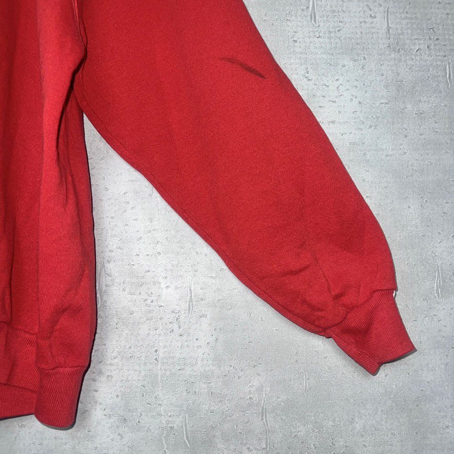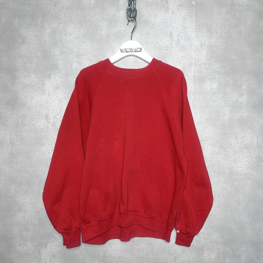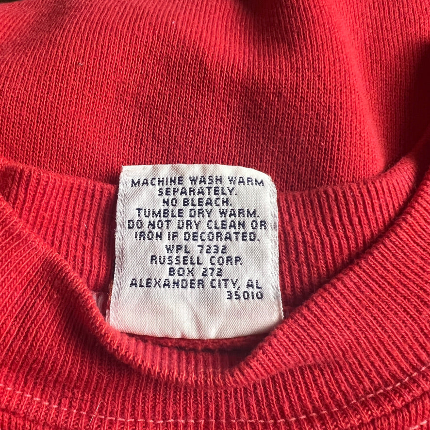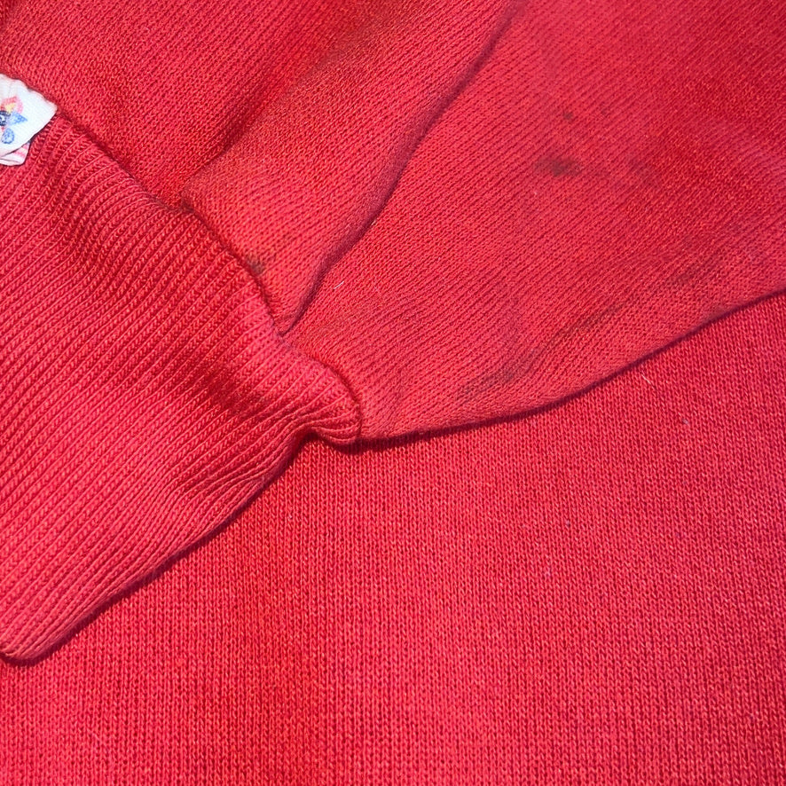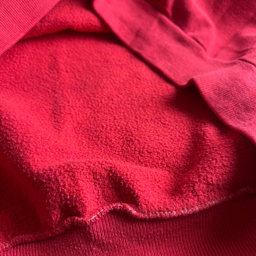 また当初は発色の良い赤であっただろう色見も、経年変化で色褪せてきた具合がまた絶妙。こういう褪せた赤は古着でしか味わえないので、ボトムスのカラーを幅広く選べるのも特徴。更にはラグランと、この80'Sらしいネックの丸みが良い。