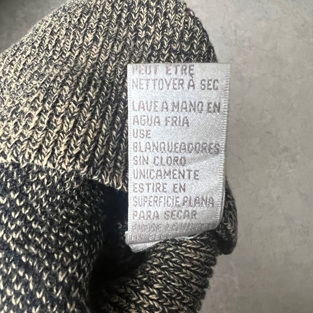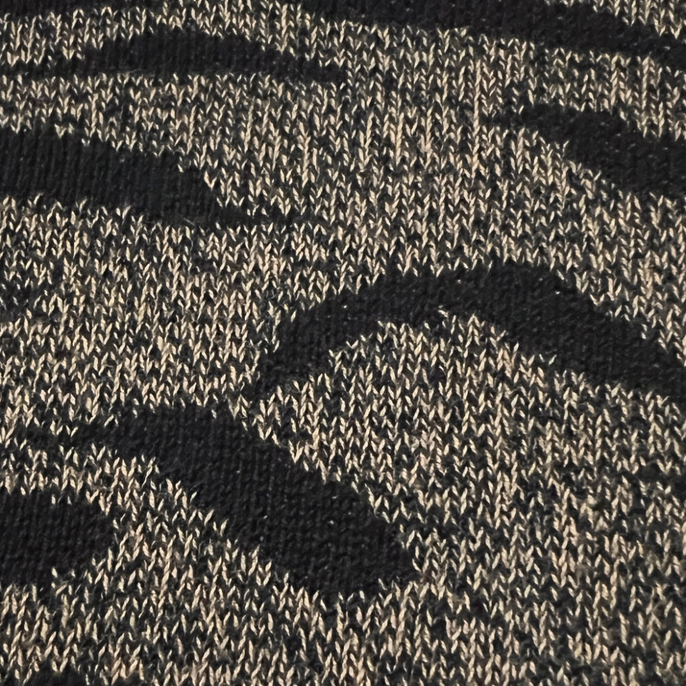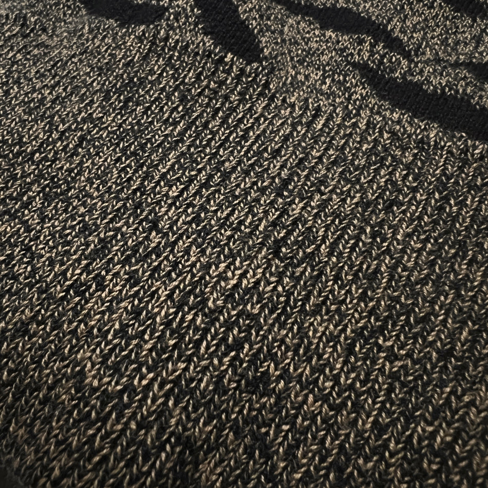 リブを含め全体がベージュ×ブラックで編まれているので、やや離れた距離からでもきちんとモザイク調に見えるのがかなり特徴的。