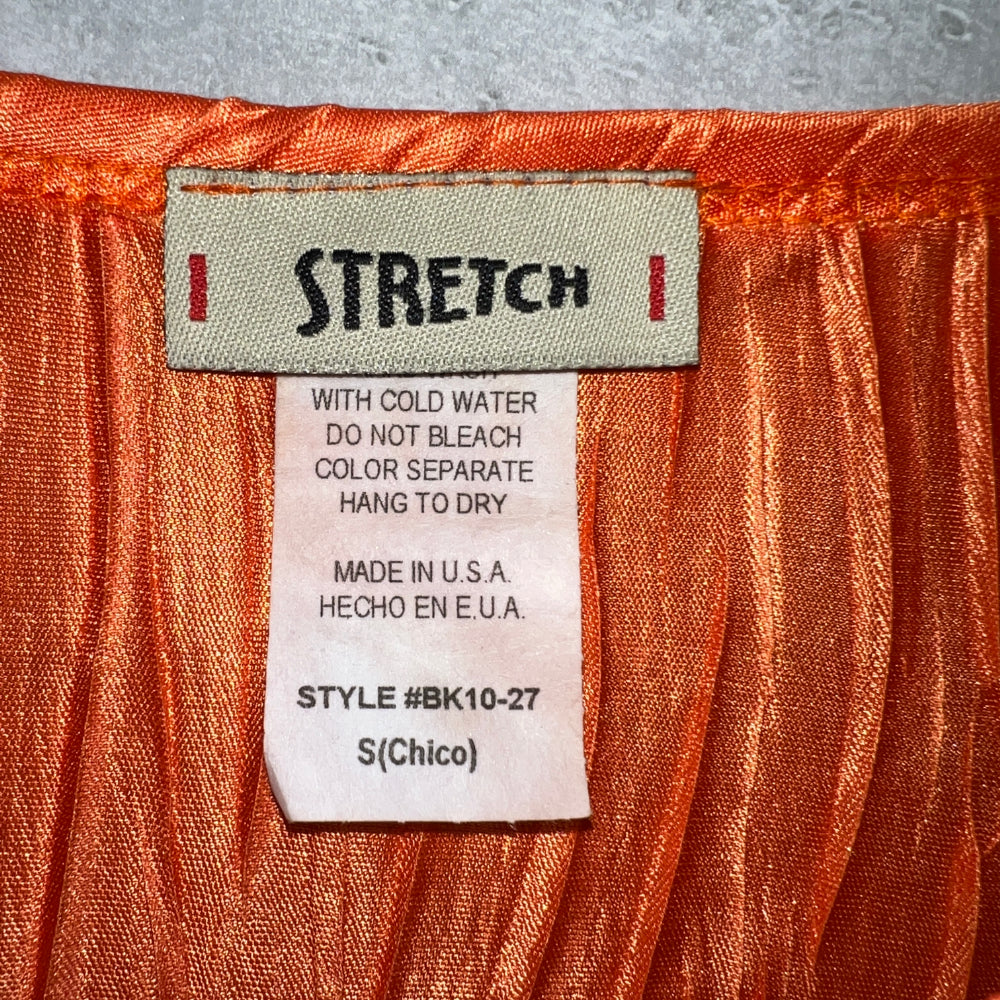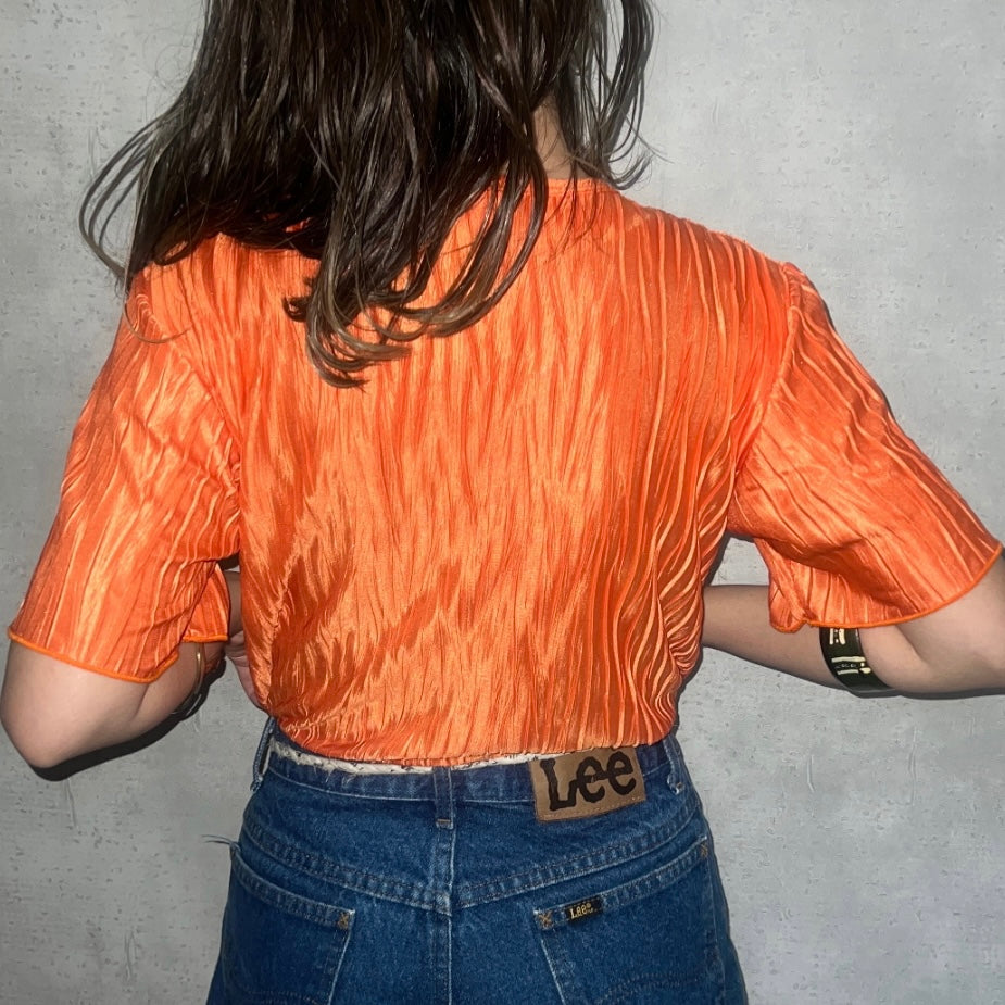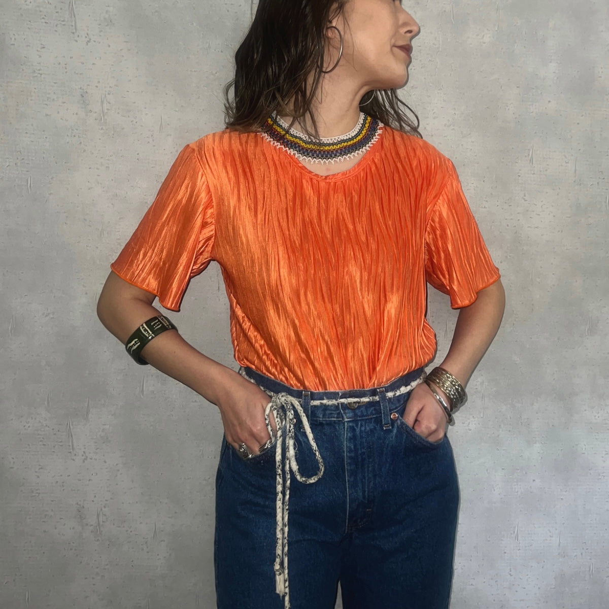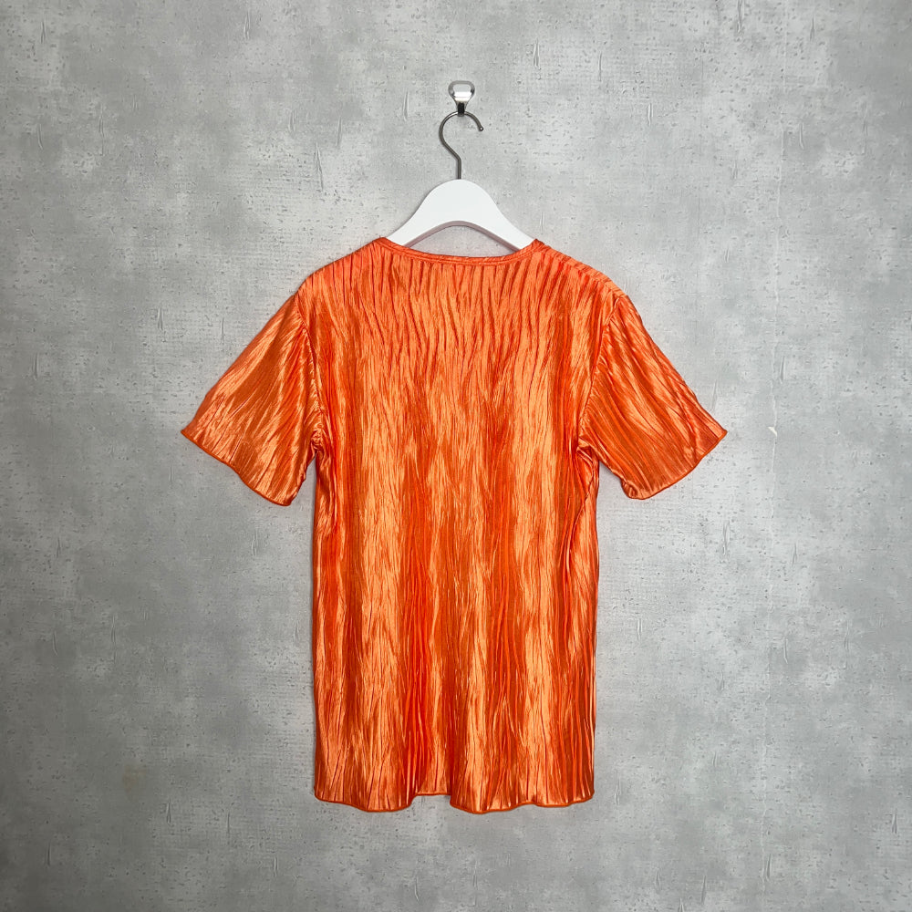 程よいネックの詰まりと、ポリエステルだからこそ表現できるこのオレンジの発色や、軽い着心地。シワになりにくくラフに使えるのが良い。