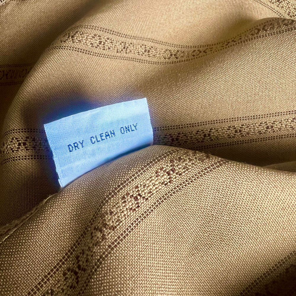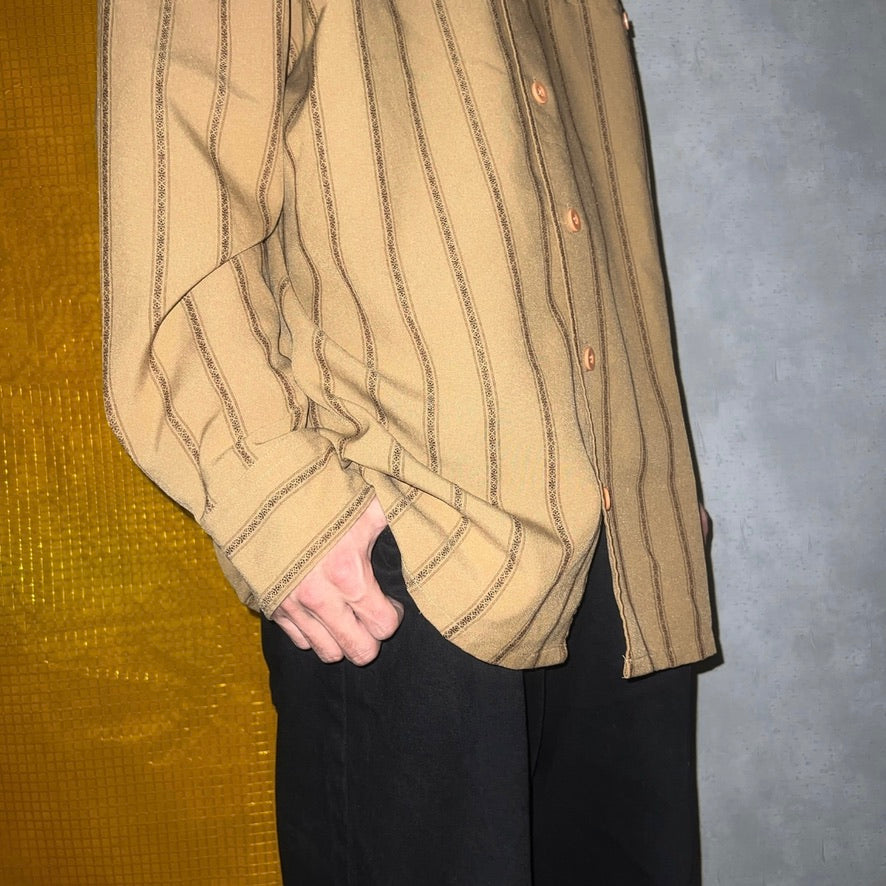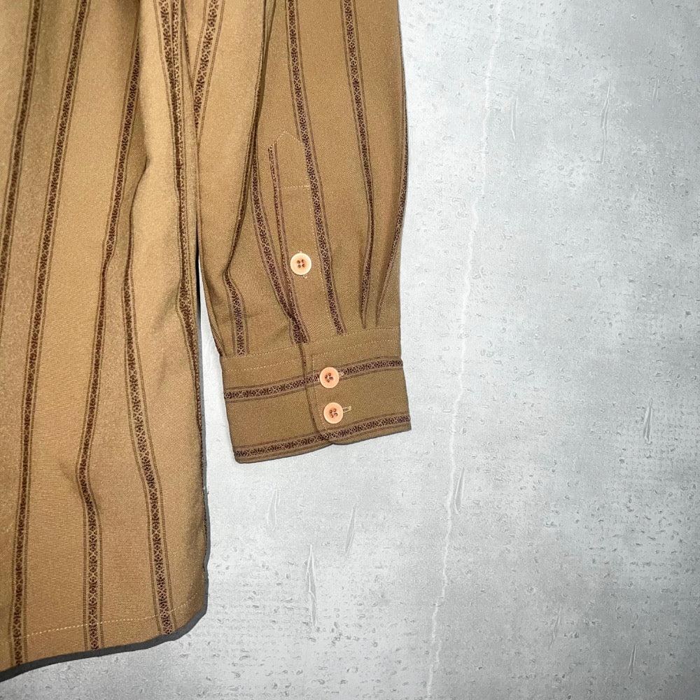 チロリアンテープにあるような柄のストライプが入り、色褪せたボタンがシャツの抜けた雰囲気と抜群に合う。ポリエステル100%でサラッとした着心地でサイズはXL、裾がボックスのため、一番上で着ても様になる利便性の高い1着。