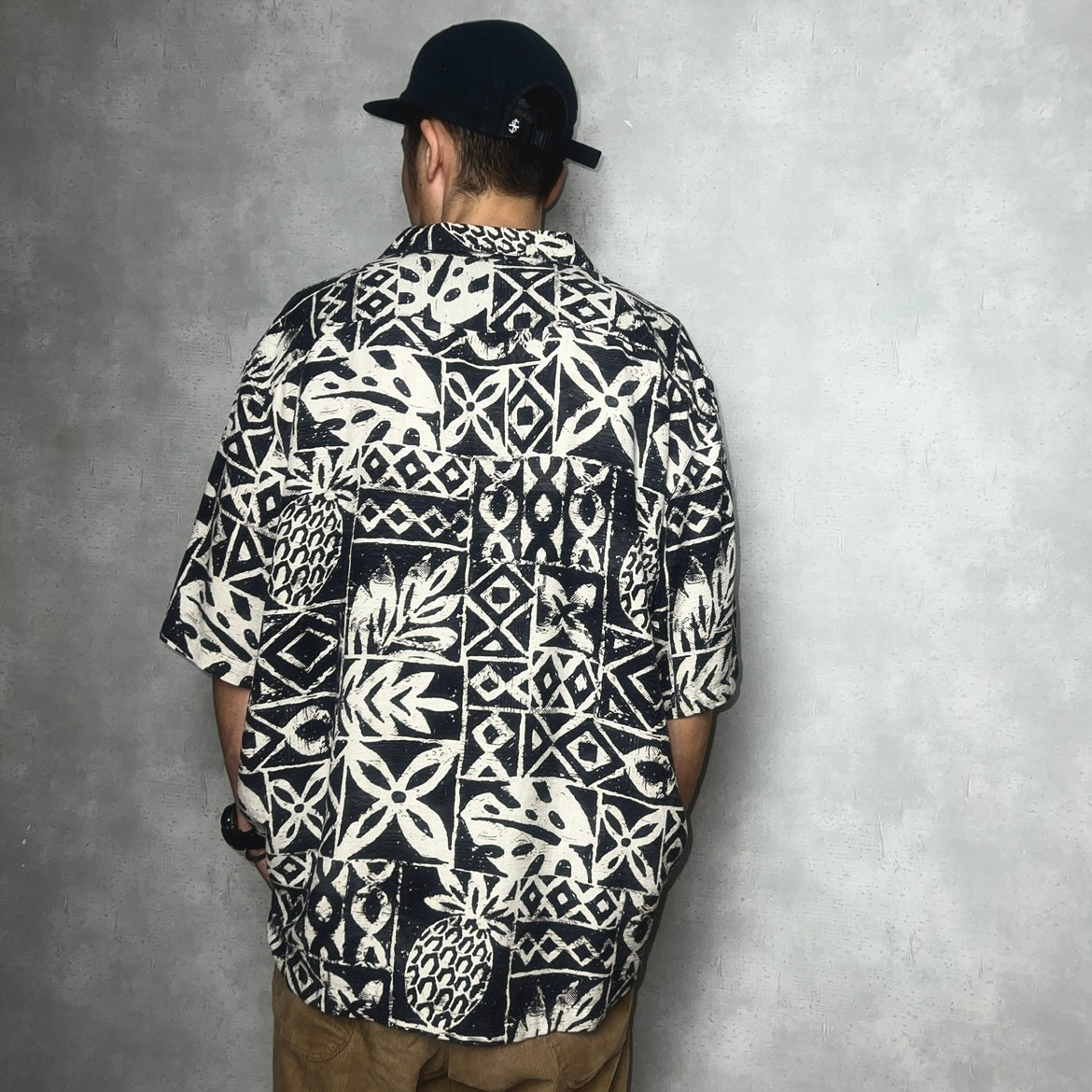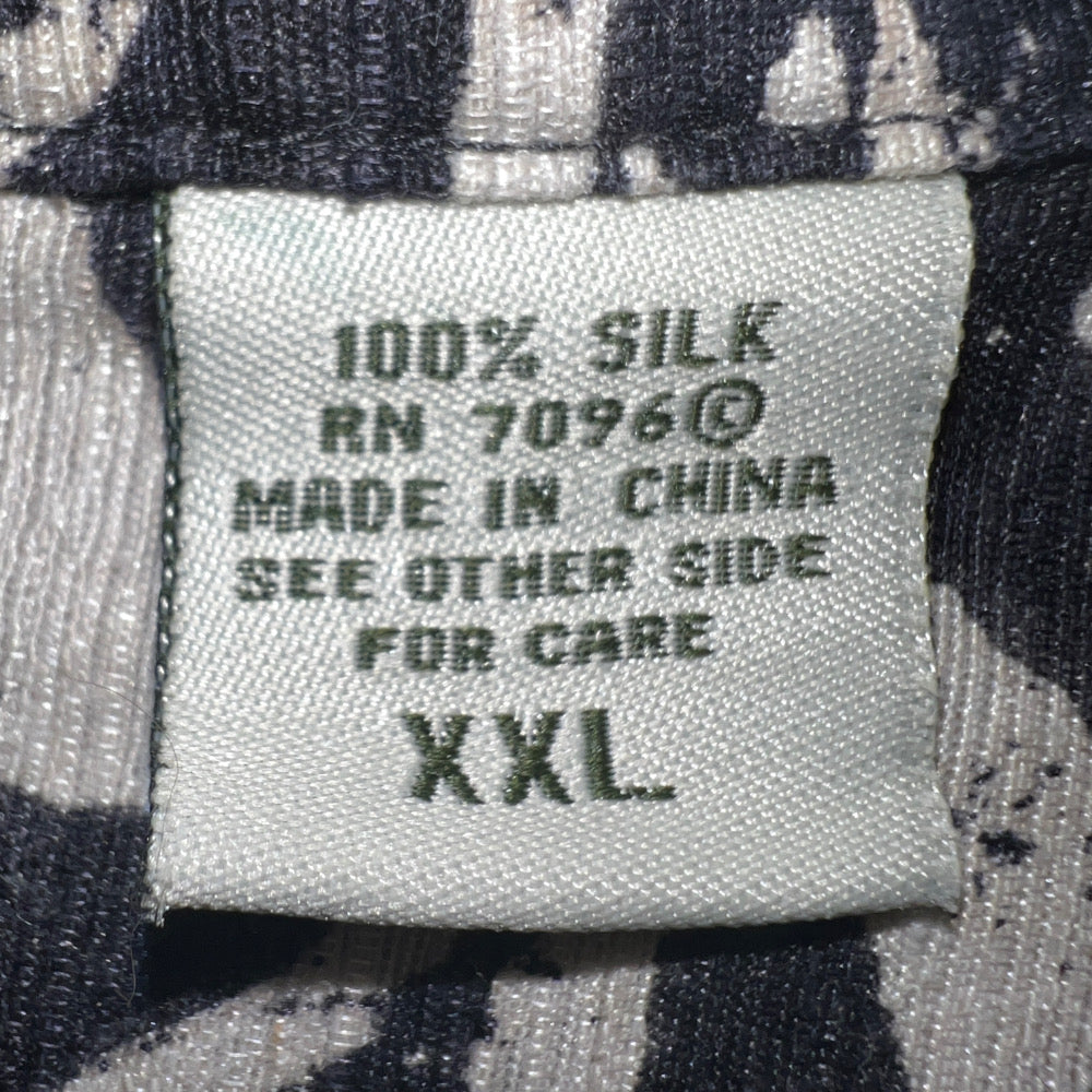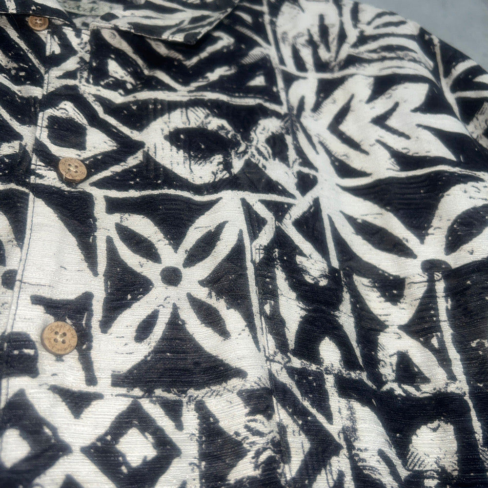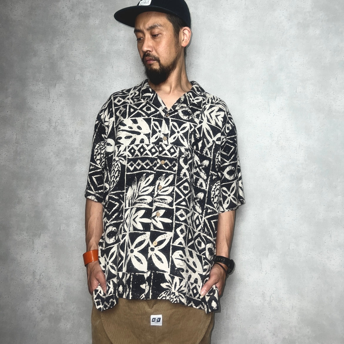 このろうけつ染めにより独特の柄の味を添える、洗えるシルク100%のアロハシャツ。