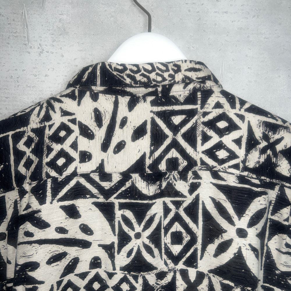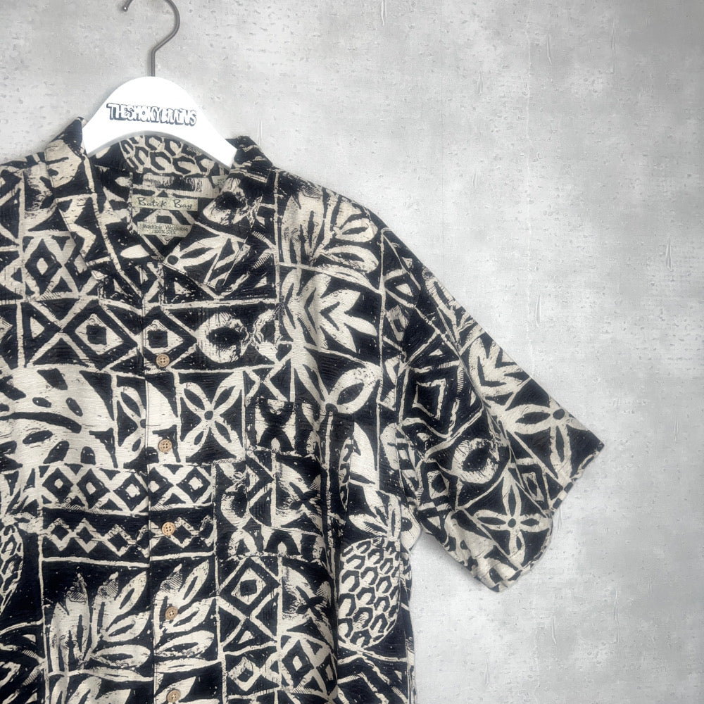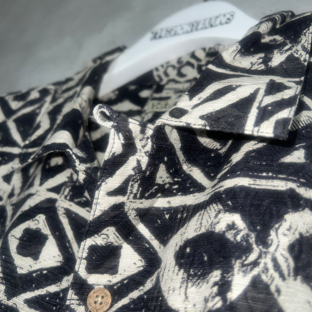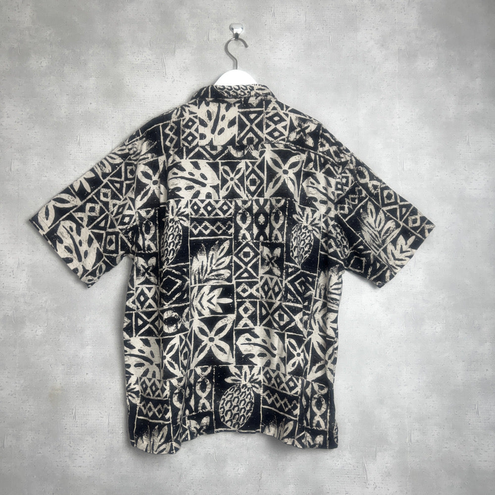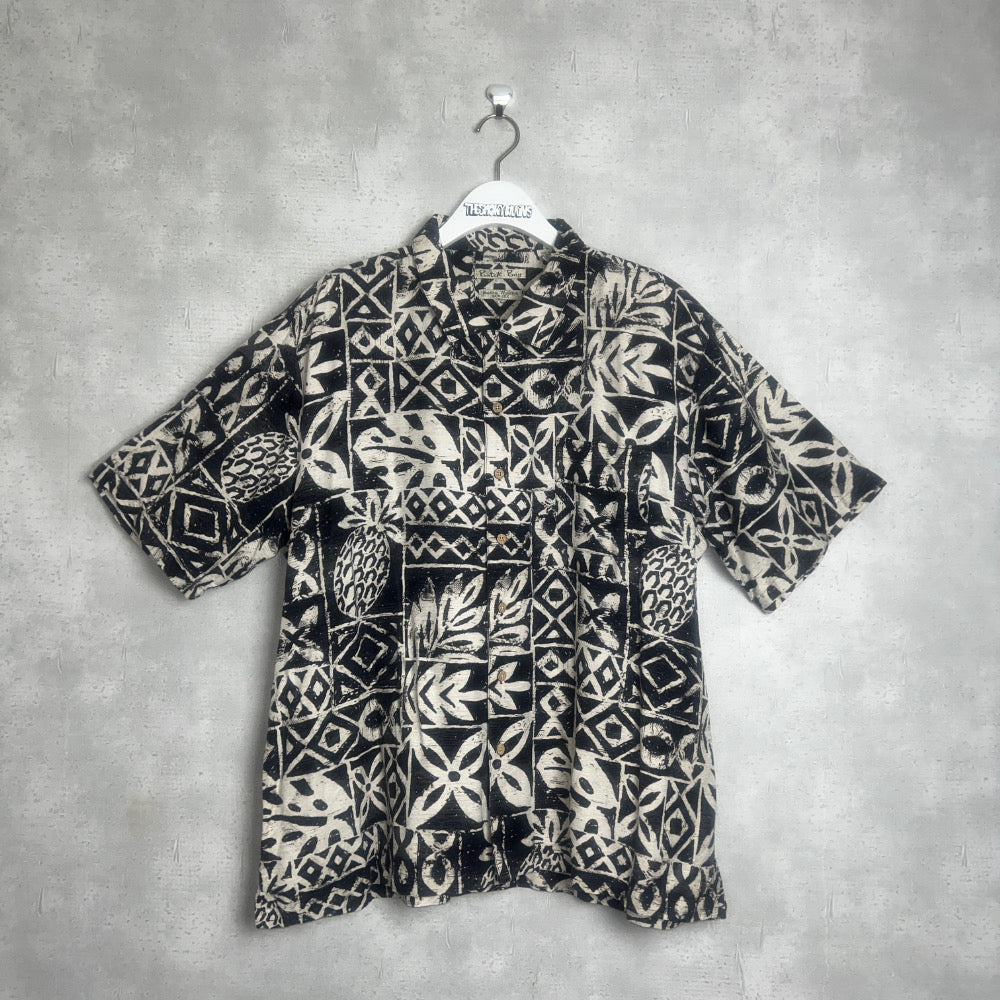 このろうけつ染めにより独特の柄の味を添える、洗えるシルク100%のアロハシャツ。