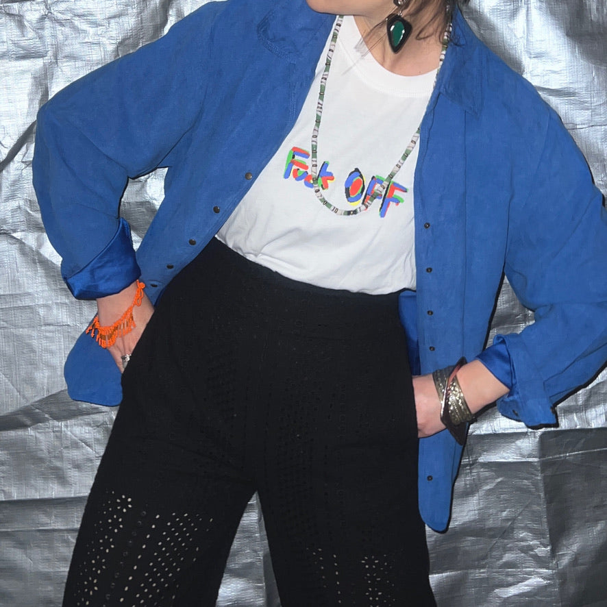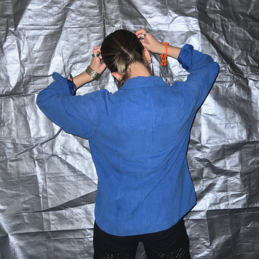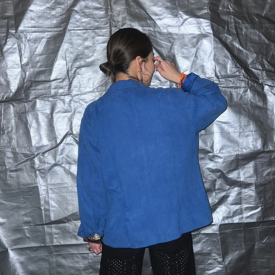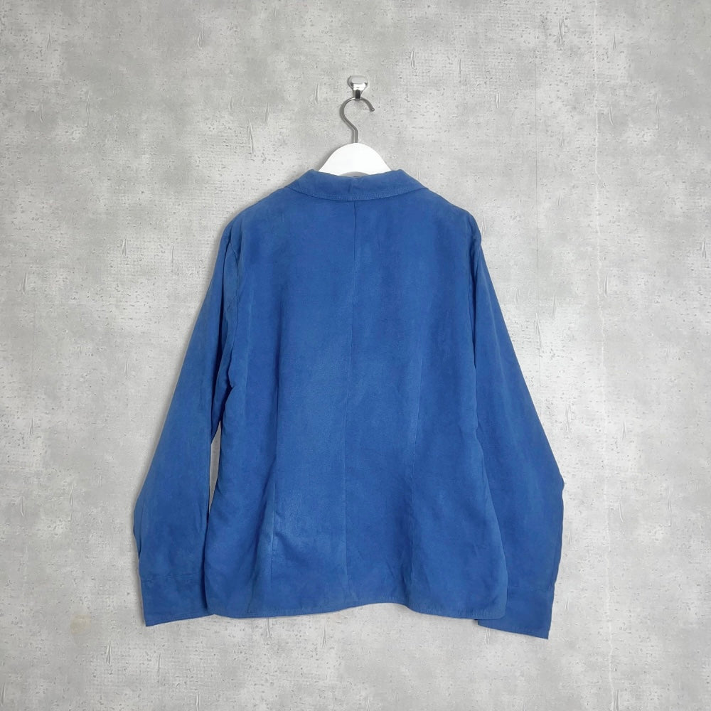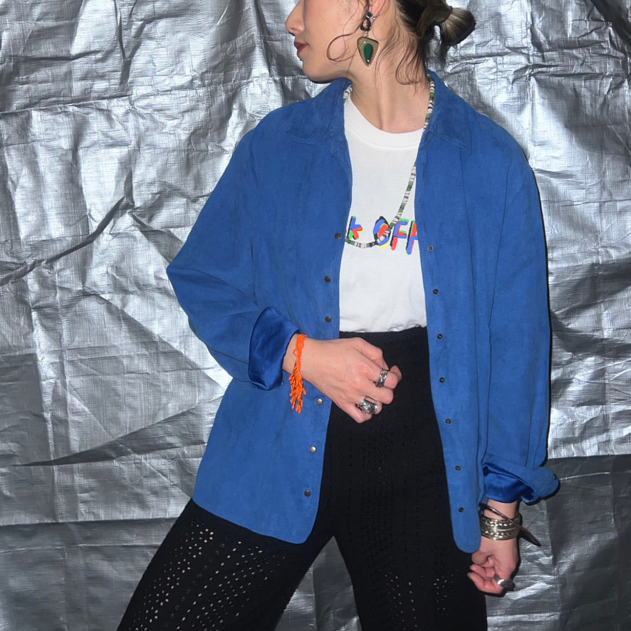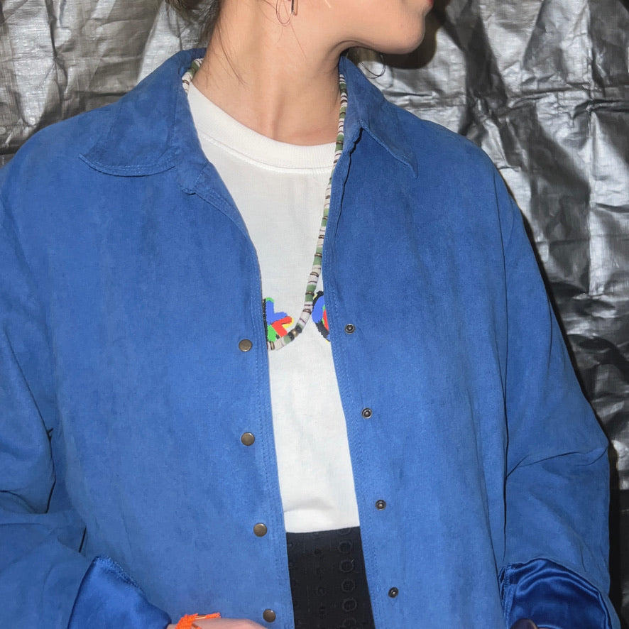 ボックスシルエットでボーイッシュな仕様ながらも、ふんわりとした生地感から女性らしさもあり、なんと言ってもこの色鮮やかなシアンブルーとフェイクスエードの相性が抜群に良い。