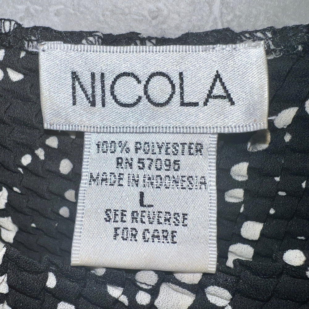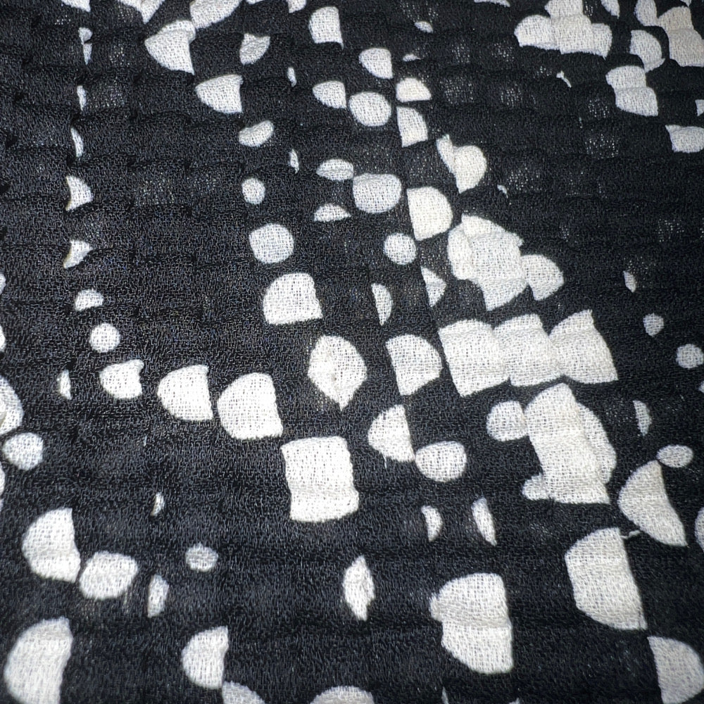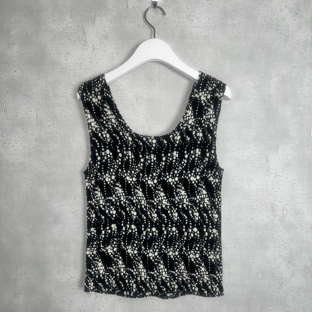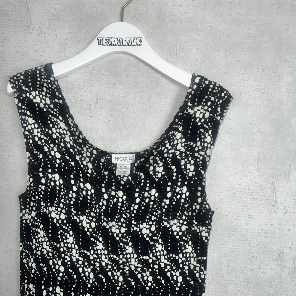 これはUSブランド*NICOLA*のモノで、このしなやかで細かなプリーツ、程よい艶感、そしてスプレーを吹きつけたようなドット上のプリントが特徴的。