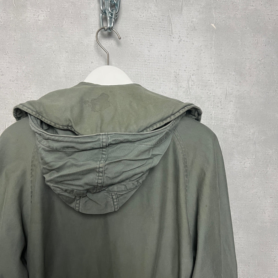 特徴的な丸襟と襟の裏にフードがしまえるパッカブル仕様で、ラグランタイプで動きも取りやすく、またサイズはSMALLだが着丈がLONGタイプなので、''S''サイズというのを感じさせないのが良い。汚れはあるが、それがまた良い雰囲気を醸し出している。