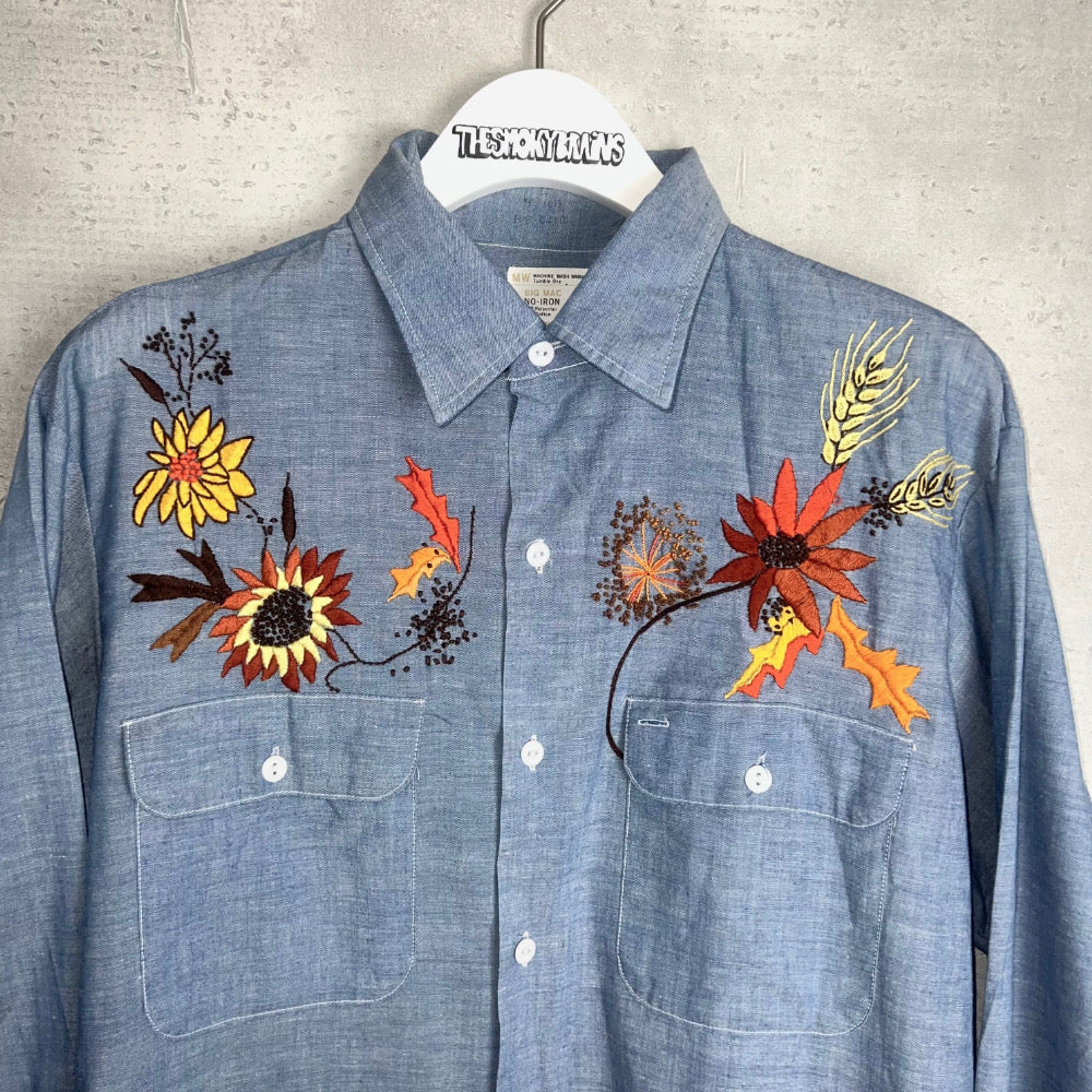 秋を彷彿とさせる植物が手刺繍で表現された[JCPenney]のストアブランドである、70'S BIG MACのシャンブレーシャツ。