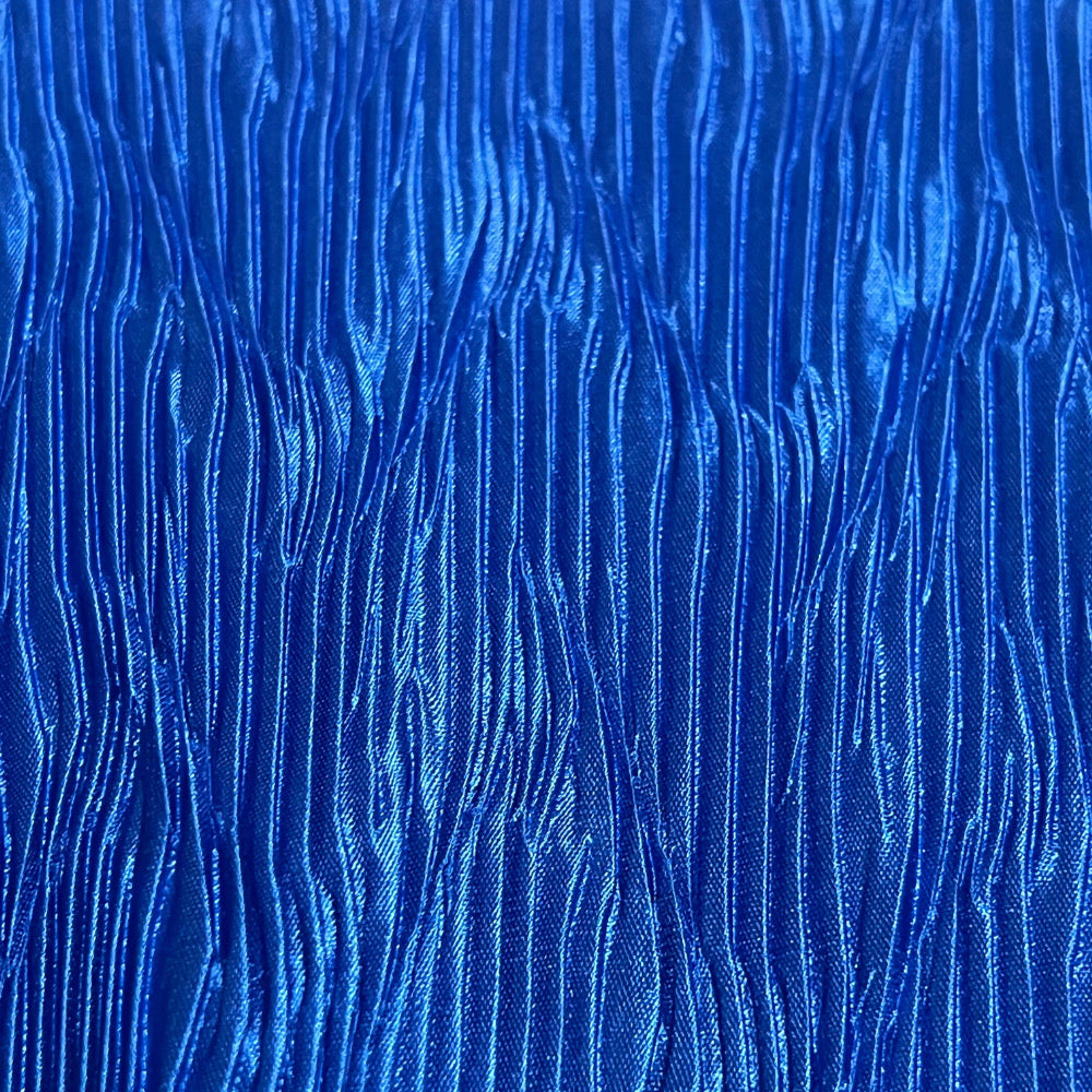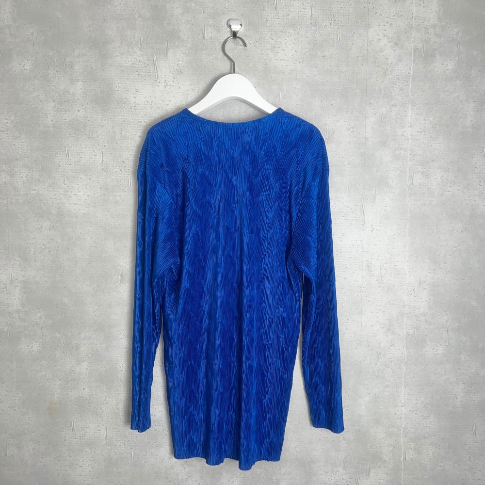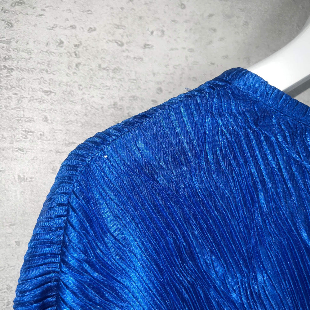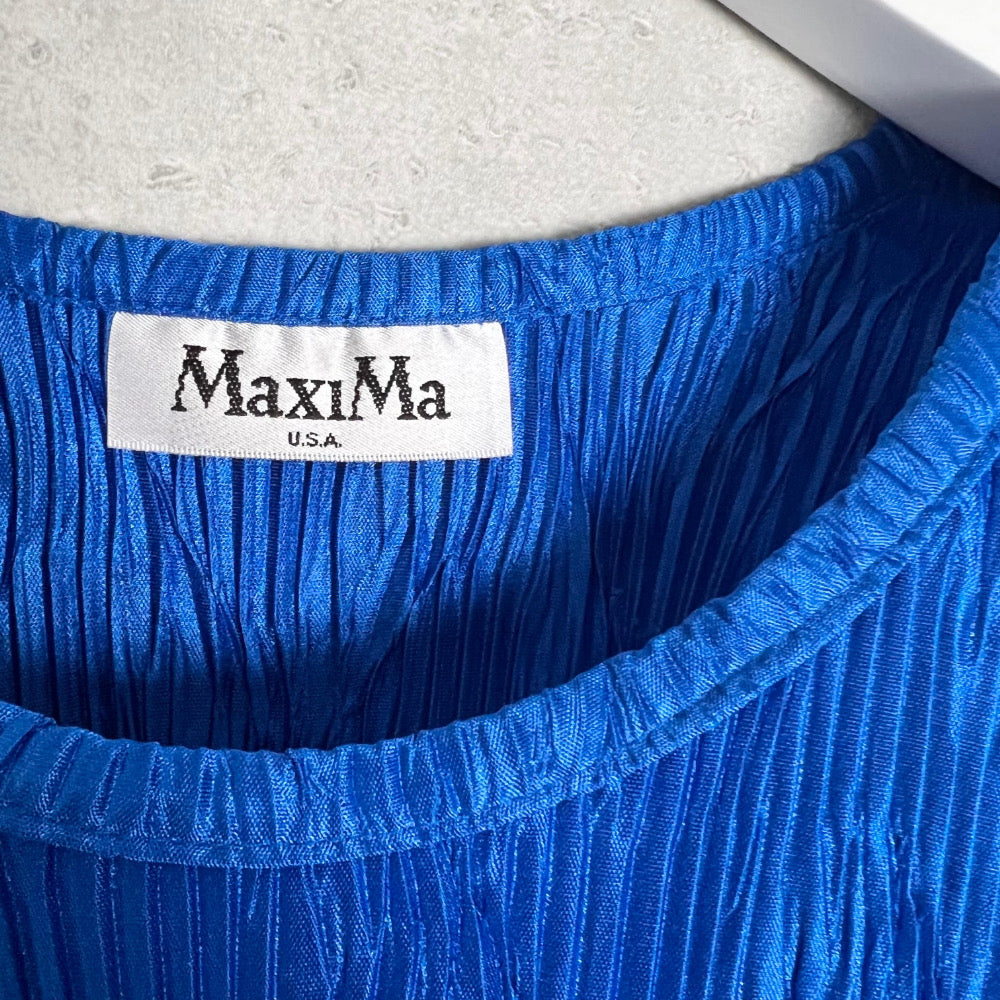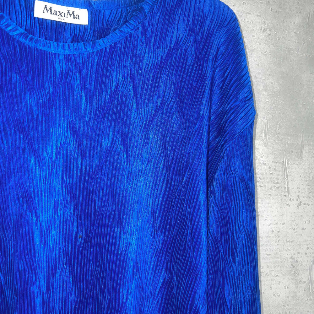 ブルーの発色と、波打つ細かなプリーツが特徴のこのブラウスは、*MaXIMa*というUSブランドのもの。