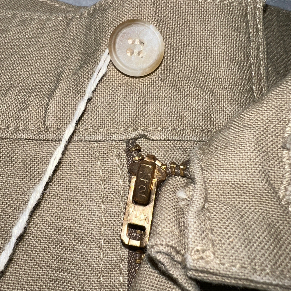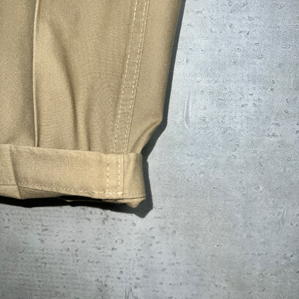前ポケットに沿って非常に深く取られた2タックが面白く、それにより腰回りが太く見えるのがまた良い。更にワタリの太さもこれまた絶妙で、全体のシルエットがとにかく綺麗で、ZIPはTALON。ルーツはトラッドなアイテムなので、ズバリなスタイリングで履くのも良いが、個人的にはあえてハイテクスニーカーを合わせ、裾で溜めて履くのもカッコ良いのでオススメしたい。サイドのボタン付きアジャストベルトで片側2.5cm(計5cm)ヒップの調整も可能。